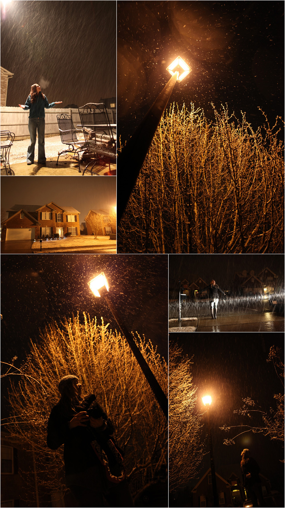 And it finally snowed!!!.. It’s been a wild winter in Alabama but even though there has been lots of snow, here in my little town we haven’t had any luck. It started last night when everybody was already sleeping and it only lasted for a few hrs leaving a couple of inches. I grabbed my camera and went outside to take some pics… my friend Sherry stopped by and was happy to model for me.. ;) I didn’t do any editing to these night shots.. they all are as they came from my camera.. all of them shot at ISO6400 f2.0 different shutter speeds and manual focus because it was soooo dark it wouldn’t focus any other way.. still I’m happy with how they look.. it was fun!! the first picture was on my tripod with my remote control.. yup, I do get excited when it snows.. lol